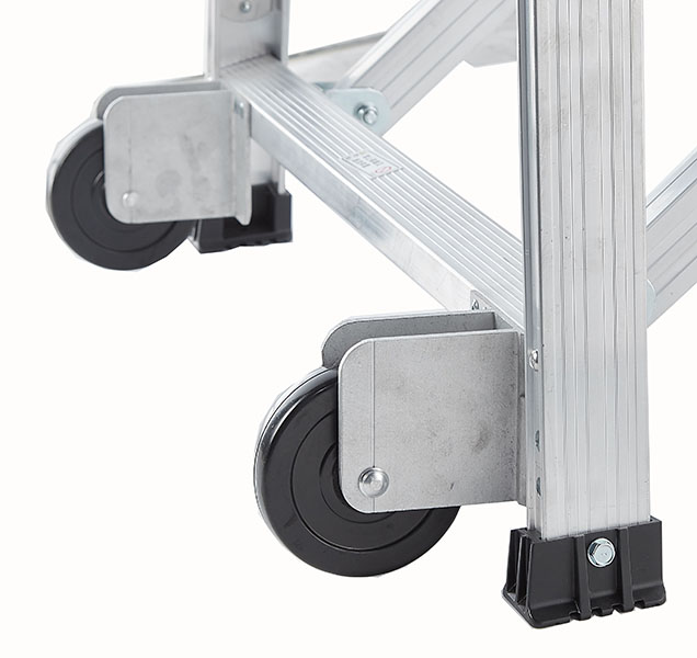 主體一件收疊延展無需組裝、半自助移動式登高作業(yè)臺,2個定向后腳輪便于移動。