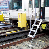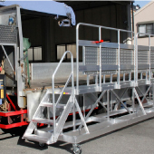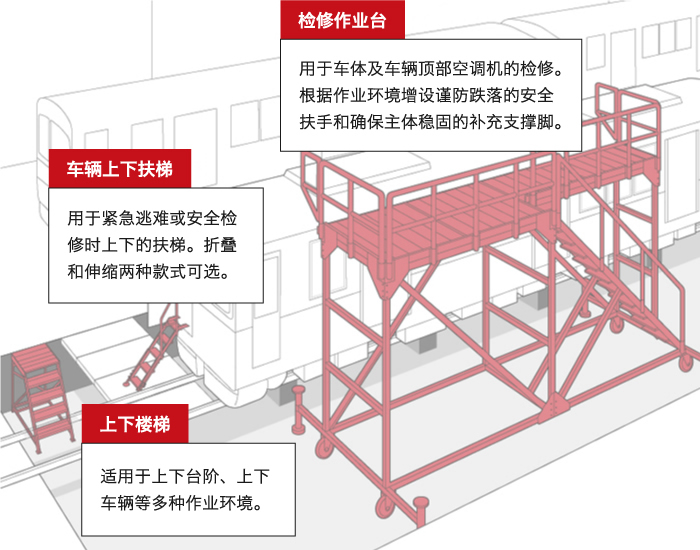 檢修車輛時(shí)的搭乘作業(yè)臺(tái)。增設(shè)扶手防止上下車輛及作業(yè)時(shí)跌落,特制的安全作業(yè)平臺(tái)。