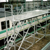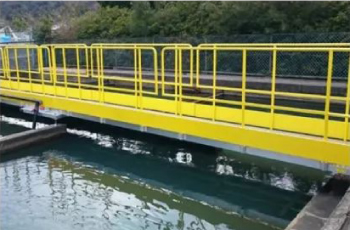 為了管理用于調(diào)查水質(zhì)的水槽而制造的步廊。為起警示作用而采用黃色涂料的扶手。