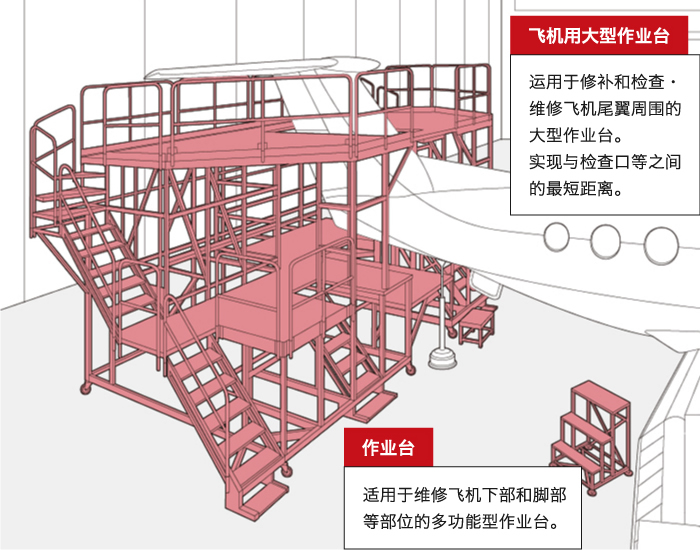 對(duì)于飛機(jī)和直升機(jī)等特殊形狀的設(shè)備,活用作業(yè)臺(tái)的滑動(dòng)功能進(jìn)行高效的維護(hù)檢修。
