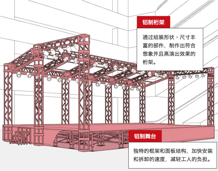 在保障安全前提下的輕量級(jí)鋁制桁架、組裝式舞臺(tái)、以及觀眾席。能夠在短時(shí)間內(nèi)搭建完工,創(chuàng)造出足夠活動(dòng)空間。