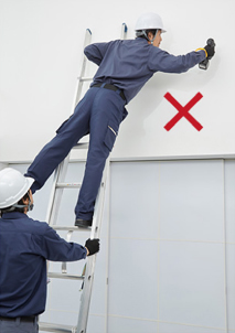 - 在梯子和屋頂之間來回移動時(shí),梯子會搖晃而不穩(wěn)定。請務(wù)必讓輔助人員扶穩(wěn)梯子,保持其穩(wěn)定狀態(tài)。